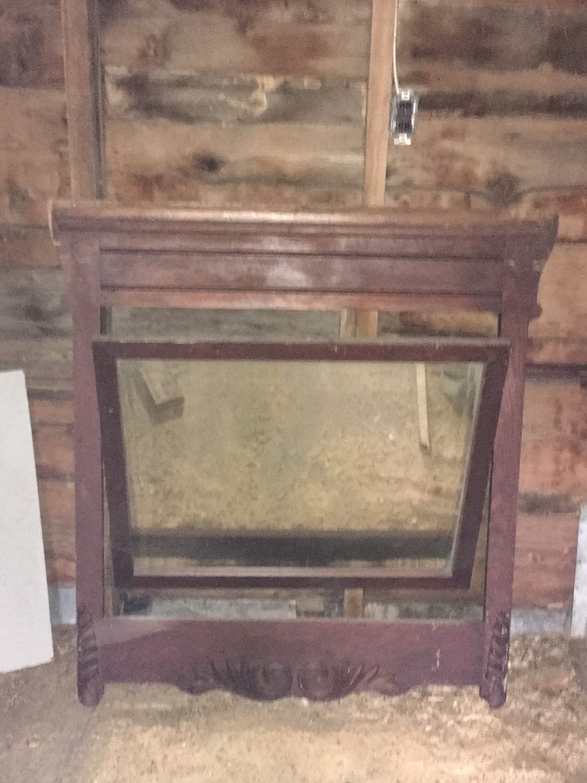 Mirror found in a barn. Assume it did go on top of a dresser. It is upside down still in this photo. |